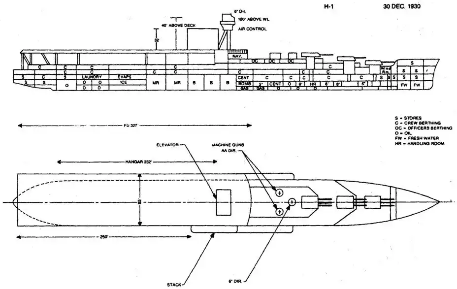 Особо отметим тот факт, что если в других странах крейсера-гидроавианосцы несли разведывательные самолёты и служили для ведения разведки при эскадре, то в американском флоте «крейсер с полётной палубой», получивший обозначение CLV, предназначался, прежде всего, для воздушного прикрытия быстроходных крейсерских групп, и лишь затем рассматривался как ударное средство.