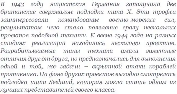 Разработка проекта Seehund («Тюлень»), также известного под названием «Тип XXVIIB», началась в первых месяцах 1944 года. В это время немецкие специалисты занимались несколькими проектами сверхмалых подлодок, что позволило авторам «Тюленя» применить ряд интересных решений. Субмарины типов Hecht и Molch создавались с максимально возможным использованием существующих агрегатов, что, как ожидалось, должно было упростить и удешевить их массовое производство. В ходе испытаний и эксплуатации выяснилось, что подобный подход не оправдал себя в полной мере. По-видимому, заказчик и разработчик заранее понимали, к чему может привести унификация и приняли определенные меры. В отличие от других сверхмалых подлодок, Seehund должна была создаваться на основе новых идей и предложений. Перед инженерами не ставилась задача обеспечить максимальную унификацию с существующей техникой. В результате удалось создать проект, имеющий большие отличия от прочей аналогичной техники. Разница была видна даже по внешним очертаниям: Hecht и Molch напоминали увеличенные торпеды с новым оборудованием, тогда как Seehund была похожа на уменьшенную подлодку. Подлодка Seehund в одном из немецких музеев. Фото Juergenthuro.deВ 1943 году нацистская Германия заполучила две британские сверхмалые подлодки типа X. Эти трофеи заинтересовали командование военно-морских сил, результатом чего стало появление сразу нескольких проектов подобной техники. К весне 1944 года на разных стадиях реализации находились несколько проектов. Разрабатываемые типы техники имели заметные отличия друг от друга, но предназначались для выполнения одной и той же задачи – скрытной атаки кораблей противника. На фоне других проектов выгодно смотрелась подлодка типа Seehund, которая могла стать одним из лучших представителей своего класса.