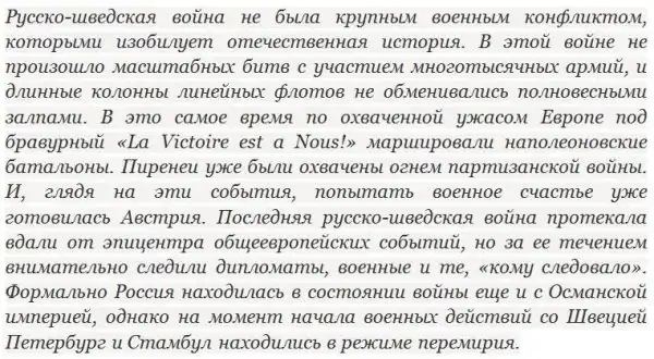 3 сентября 1809 г. во Фридрихсгаме был подписан мирный договор, который отдавал Финляндию, Аландские острова и часть Вестерботтен в состав Российской империи. Закреплялся союз Швеции и Дании с наполеоновской Францией. Таким образом, утрата всех сенявинских достижений в Средиземном море и Адриатике частично компенсировалась приобретением Финляндии. Другой вопрос, что ее население было гораздо менее лояльно к России, нежели подданные Республики Семи Островов. Передышка на севере для России оказалась недолгой. На пороге была Отечественная война 1812 года, Бородинское поле, пожар Москвы и неизбежная Березина.