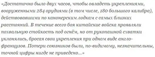Форты правого берега также были оставлены при одном появлении англо-французской пехоты – лишь отдельные группы маньчжурских солдат вступали в рукопашную, решаясь скрестить свои мечи со штыками европейцев. К полудню все укрепления на обоих берегах оказались в руках нападавших. Русские военные специалисты тех лет Бутаков и Тизенгаузен писали:
