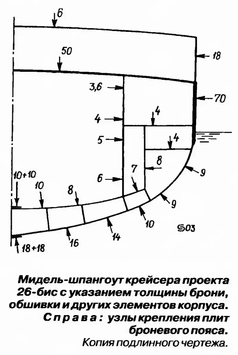Создатели проекта 26 и 26-бис пошли по другому пути – проектировали крейсер так, чтобы в районе бортов оказалось большое количество небольших по объему отсеков. При этом крейсер по длине был разделен на 19 водонепроницаемых отсеков, причем водонепроницаемые переборки ниже броневой палубы делались сплошными, не имея никаких дверей либо горловин. Подобная защита не была, конечно, столь же эффективна как ПТЗ американского типа, но она все же могла существенно ограничить затопление корабля и, вероятно, могла считаться оптимальной для легкого крейсера.