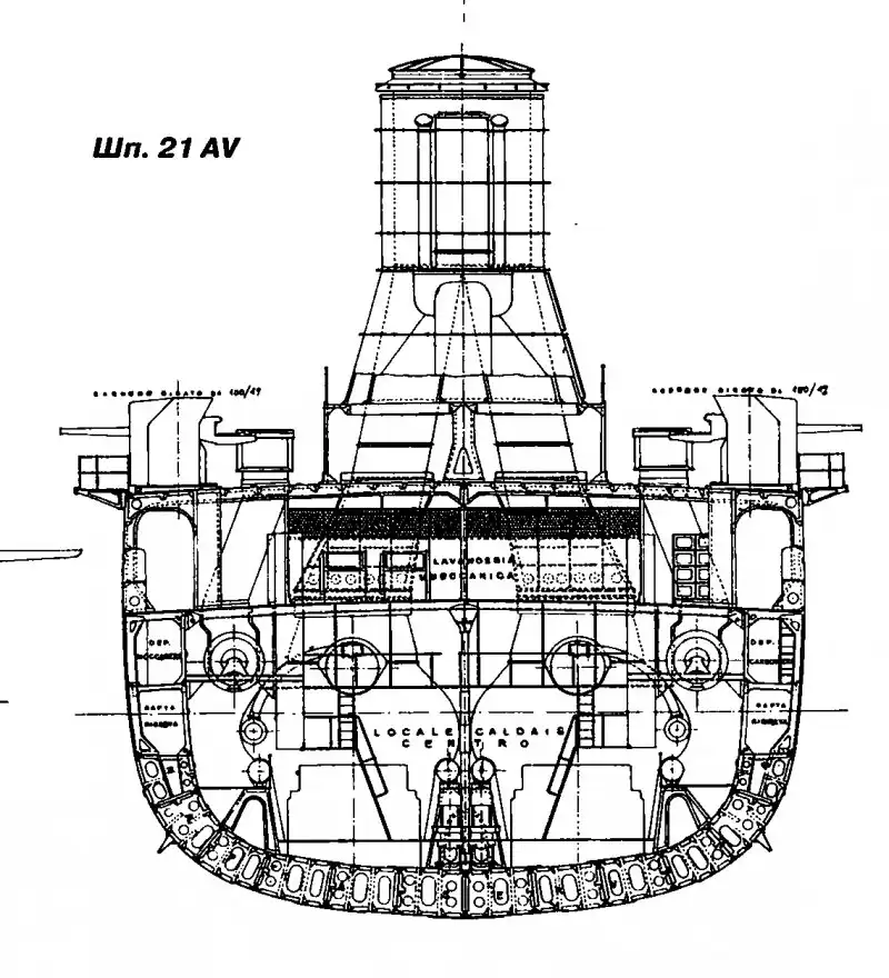 Итальянцы построили немало четырехвальных крейсеров, но на своих «Кондотьери» они изначально планировали ставить двухвальные энергетические установки, что потребовало очень мощные турбинные агрегаты. С энергетическими установками крейсеров типа «Альберико да Барбиано» и следующих за ними «Луиджи Кадорна» получилось не очень хорошо, но зато итальянцы приобрели необходимый опыт, так что турбины и котлы для последующих серий «Раймондо Монтекукколи» и «Эудженио ди Савойя» оказались не только мощными, но и вполне надежными. Необходимость всего лишь двух турбинных агрегатов (и по три котла на каждого) позволила расположить их «рядком», при этом расстояние от котлов и машин до бортов оказывалось достаточно большим, чтобы… что? Как ни крути, но серьезной ПТЗ в габаритах легкого крейсера создать невозможно. Все эти противоторпедные (в том числе – бронированные) переборки… даже на линкоре «Ямато» срабатывали через раз. Вспомнить хотя бы ПТЗ линкора «Принс оф Уэллс» - весьма крепкую конструкцию попросту вбило вглубь корпуса, отчего отсеки, которые она призвана была защищать, все равно затопило.