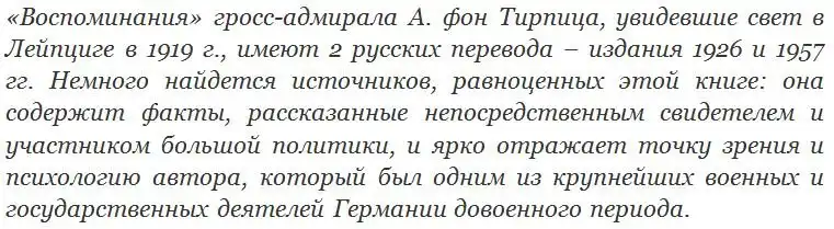 Как бы ни относиться к бывшей Германской империи и к ее руководителям, эта личность, столь выделяющаяся среди своих коллег и в то же время столь типичная для германской психологии и образа немецкого мышления, стоит особняком, а знакомство с ней производит огромное впечатление. Бытует мнение, что политическое руководство Германии эпохи Первой мировой войны состояло из посредственностей. Сам А. фон Тирпиц склоняется к этому мнению. В его глазах между поколением Бисмарка-Мольтке и его поколением – целая пропасть. Конечная катастрофа Германии в значительной степени является для него результатом несоответствия между людьми и возложенной на них задачей. Как бы то ни было, сам А. фон Тирпиц представляет в этом смысле исключение. Особое уважение вызывают сила его воли и напряженное стремление к реализации поставленной цели.