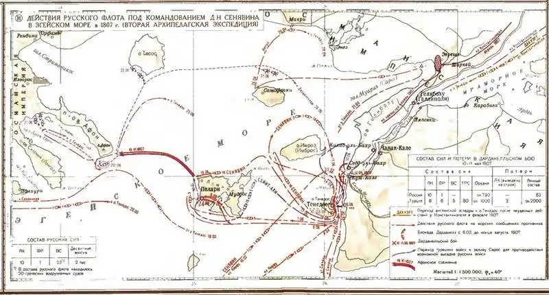 Вскоре Сенявин получил увесистую по объему и не менее масштабную по содержанию инструкцию из Петербурга за подписью морского министра Чичагова – на случай войны с Турцией. Русской эскадре предписывалось избрать главной своей целью Стамбул, ядро Оттоманской империи. При этом документ был просто загроможден второстепенными задачами, как Северный морской путь – льдами. Кроме своей главной цели Сенявин должен был захватить несколько островов Архипелага, в том числе Родос, осуществлять блокаду Египта, не допустить морского сообщения между Турцией и Францией, отправить несколько кораблей к Сицилии для поддержки находившегося в бедственном положении неаполитанского короля. И вдобавок эскадра должна была защищать Ионические острова. Фактически эта, пребывающая в весьма отдаленных эмпиреях от реального положения дел, инструкция была не осуществима. Не иначе как в Петербурге полагали, что Сенявин командует группировкой, сопоставимой по численности как минимум с Непобедимой армадой.