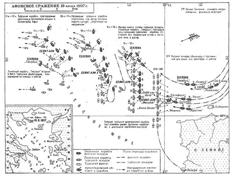 Победа в Афонском сражении открывала новые возможности для русских сил в Эгейском море, однако европейские обстоятельства вмешались в ход этой войны. В произошедшем накануне другом сражении, Фридландском, Наполеон нанес поражение армии Беннигсена, и встреча императоров на большом плоту посреди Немана уже состоялась. Возвращение Сенявина на Тенедос произошло в тот же день, когда окончательно был оформлен Тильзитский мирный договор, и в истории России открылась новая страница.
