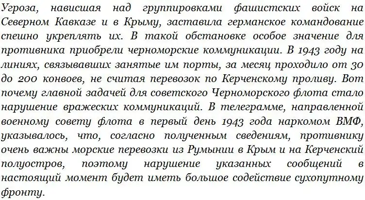 Действия подводных сил Черноморского флота в первый период войны .), Черноморский флот, в том числе и его подводные силы, продолжали наращивать усилия в борьбе на неприятельских коммуникациях. За два первых месяца 1943 года только подводные лодки (ПЛ) потопили 11 транспортов, две шхуны, пять десантных барж и повредили два танкера, транспорт, десантную баржу противника.
