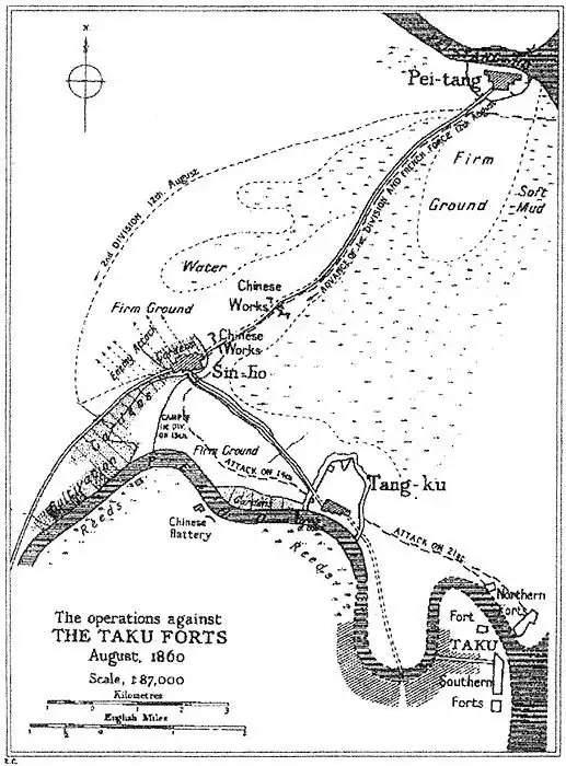 Утром 1 августа 1860 года 38 канонерских лодок доставили в устье Бэйтанхэ шлюпки с десантом. Неспешно высадившись на южном берегу, союзники к ночи заняли деревню Бэйтан, имевшую около 30 000 населения (по европейским меркам это был город), и близлежащий форт. Никакого сопротивления они, к своему удивлению, не встретили – деревня и форт не были заняты китайскими частями. Лишь две сотни маньчжурских всадников издалека наблюдали за действиями десанта.