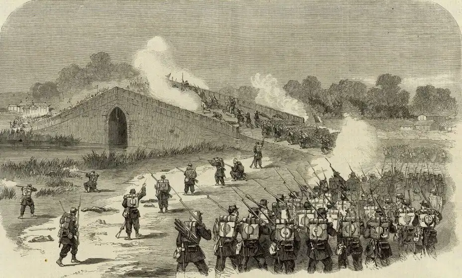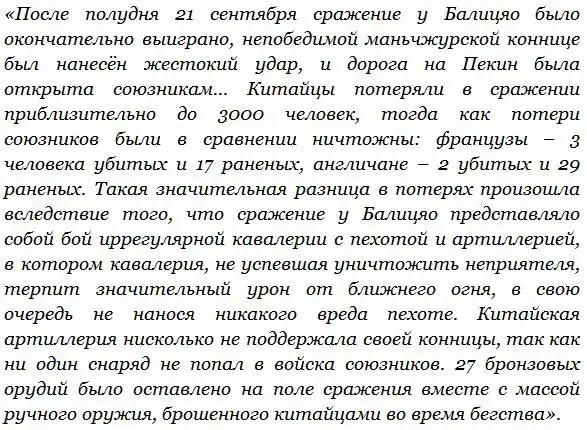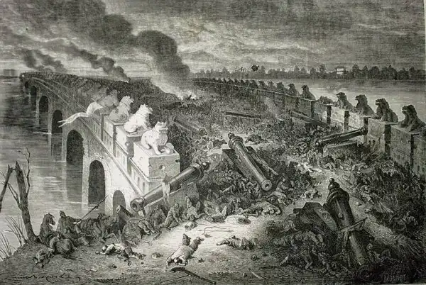 Уже 21 сентября 1860 года, на третий день после боя у Чжанцзяваня, началась битва за Пекин. Противники сошлись у деревни Балицяо, рядом с которой располагался одноименный каменный мост через Императорский канал – один из нескольких старинных мостов в окрестностях Пекина, украшенных мраморными фигурами львов.