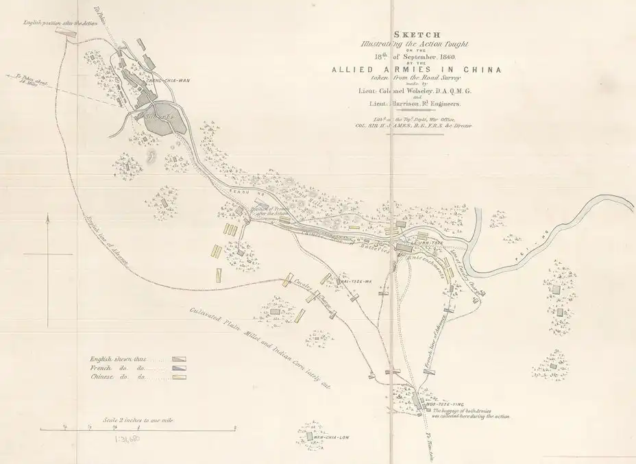 Успешно высадившись на берегах столичной провинции Китая и заняв мощные форты Дагу, англо-французская армия 9 сентября 1860 года выступила в поход на Пекин. Набранные в Тяньцзине гужевые повозки, их возницы и погонщики при первой возможности разбежались, и союзному командованию пришлось организовывать движение обоза на захваченных джонках по Императорскому каналу. Войска же шли по грунтовой дороге вдоль правого берега канала. В течение похода европейцы не прекращали переговоров с китайскими представителями – до тех пор, пока утром 18 сентября, находясь в одном дневном переходе от Пекина, их передовые части не обнаружили развёрнутые в поле войска империи Цин.