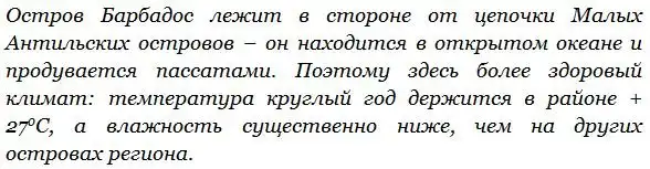 Испанским остров оставался недолго: конкистадоры пытались поработить живших здесь воинственных индейцев племени карибе, но те долго сопротивлялись, и после кровопролитных войн обе стороны покинули Барбадос. В итоге, когда в 20-х годах XVII века здесь появились англичане, остров оказался необитаемым. На протяжении последующих трёх с половиной веков Барбадос был под контролем Великобритании, хотя и пользовался всё это время широкой автономией. В 1966 году он стал независимым государством.