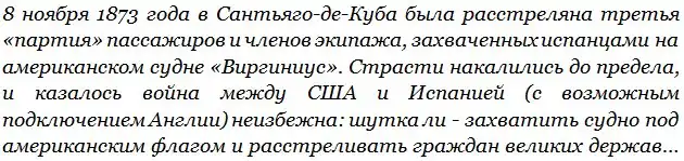 (Однако такие «треволнения» оказались роковыми для еще не старого вроде парохода – 26 декабря 1873 года он затонул на переходе в Атлантике у мыса Гаттерас). Понятно, что лет двадцать спустя такие уступки ни в коей мере не устроили бы Вашингтон, но в 1873 году воевать с Испанией Штатам было не с руки.