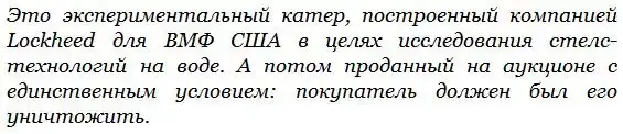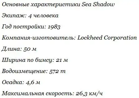 Это не новая разработка — «Морская тень» была спущена на воду в далёком 1984 году, но вплоть до 1993-го её существование держалось в глубочайшем секрете. Это не совсем катамаран; компоновка Sea Shadow называется SWATH (англ. Small Waterplane Area Twin Hull, двухкорпусное судно с малой площадью сечения по ватерлинии).