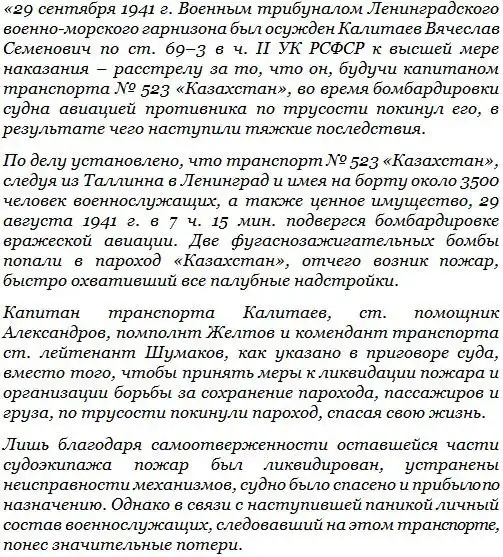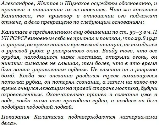 Если бы бедная женщина знала, что она уже опоздала… Однако, как оказывается, в распоряжении принимавших решение о расстреле В. С. Калитаева ещё до расстрела и даже до вынесения приговора мог иметься ряд материалов, которые полностью оправдывали капитана «Казахстана». Но после приказа Наркома обороны от 12 сентября 1941 года, где В. С. Калитаев был прямо назван дезертиром, система уже не могла сделать такого шага назад.