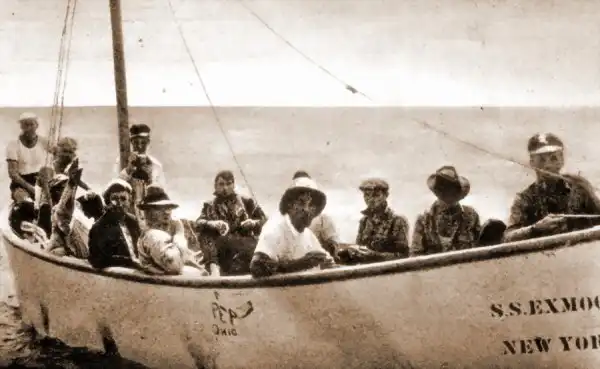 Моряки из экипажа «Робина Мура» в спасательной шлюпке.