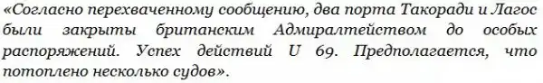 U 69 прекрасно справилась с поставленной задачей и стала первой «семёркой», действовавшей в южных водах Атлантики. 4 июня Метцлер отправил сообщение в Дёницу о минировании портов с расходом четырёх мин на Такоради и восьми на Лагос. В тот же день при входе в гавань Лагоса подорвалось на минах и затонуло британское судно. Адмиралтейство, обеспокоенное этим случаем, объявило оба порта временно закрытыми, о чём стало известно немцам. 29 июня адмирал Дёниц сделал в журнале боевых действий командующего подводными силами следующую запись: