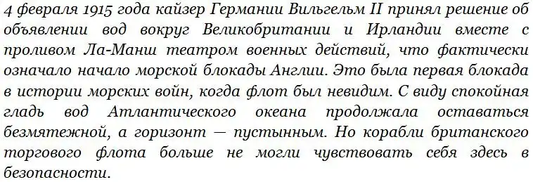 В ходе Первой мировой войны германские подводные лодки продемонстрировали гигантские возможности, нанеся Великобритании серьезный ущерб. Однако добиться полной победы благодаря своевременным действиям союзников и введению ими новой тактики противодействия с помощью «подводного оружия» так и не удалось. Богатый опыт, полученный немцами в 1914-18 годах, был хорошо изучен, и на этой основе немецкие теоретики разработали новую тактику ведения подводной войны, которая вовсю использовалась в годы гораздо более масштабного и кровавого конфликта, потрясшего человечество спустя всего 20 лет. Впрочем, и тогда это не принесло немцам победы.