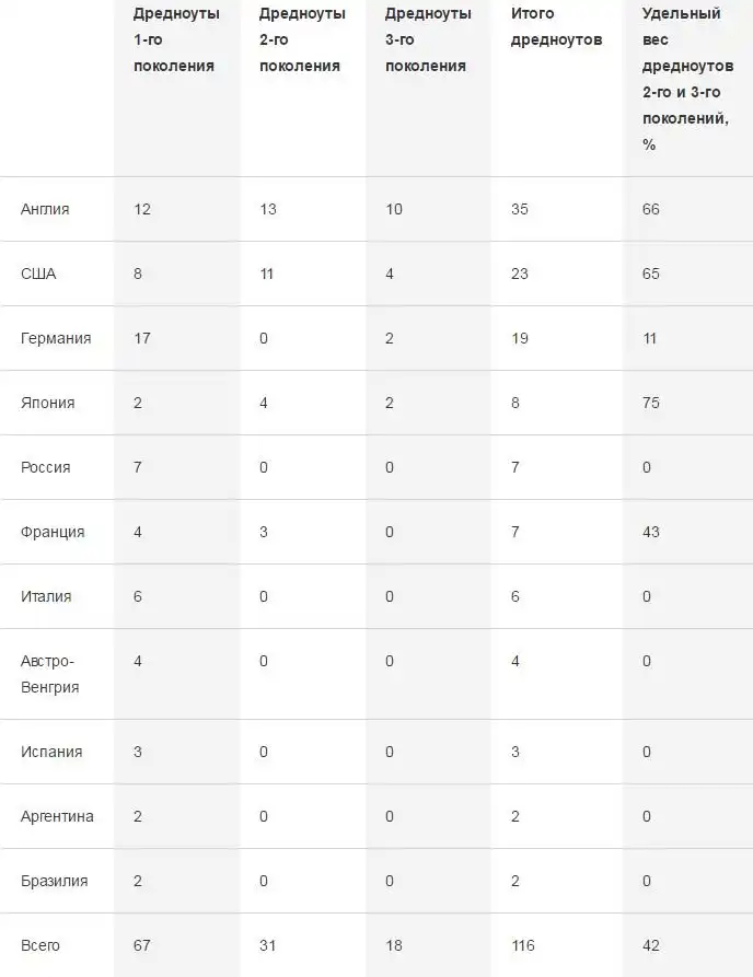Таким образом, дредноуты были включены в состав своих флотов одиннадцатью странами, включая Испанию с её мини-дредноутами водоизмещением в 15 800 т (строительство сверхлинкора для Греции в Германии было прервано с началом войны, а строившийся в Англии чилийский дредноут был реквизирован и включён в состав британского флота). Дредноуты 2-го и 3-го поколений имелись в пяти странах, причём наибольший удельный вес современных линкоров (75%) имел флот Японии – страны с весьма ограниченными финансовыми возможностями и без сильных кораблестроительных традиций. У историков нет однозначного мнения о причине интенсивного строительства дредноутов в Японии. По одной версии, это было вызвано всемирной гонкой морских вооружений. По другой – японцы уже в начале ХХ века готовились к войне с США. В пользу последней версии косвенно свидетельствует решение строить дредноуты английского типа с большой дальностью действия – для войны с Россией и Китаем линейный флот был практически не нужен, а ведение линейного боя против англо-французского флота представлялось самоубийством. Благодаря своевременному переходу к строительству дредноутов нового поколения японцам удавалось поддерживать военно-морской паритет с американцами вплоть до начала 20-х годов, а японские сухопутные войска по численности, оснащению и боевой подготовке превосходили противника.
