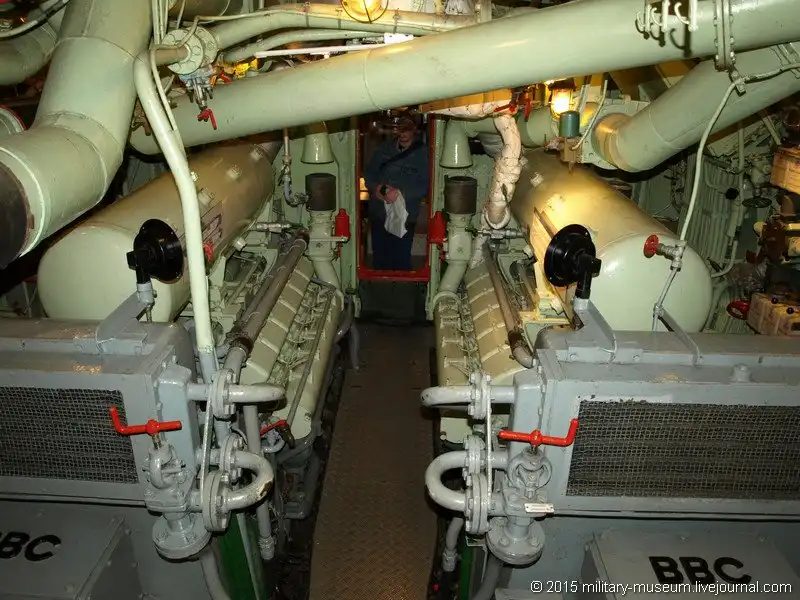 Следующий отсек - пятый - машинный. Там расположены два шестицилиндровых дизеля MAN мощностью по 2000 л.с. и электродвигатели (два сдвоенных основных электродвигателя SSW для полного подводного хода, по 2500 л.с. и два вспомогательных электродвигателя SSW для "бесшумного" хода, по 226 л.с.). Вид на дизели: