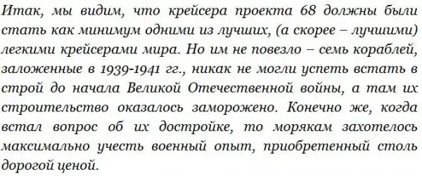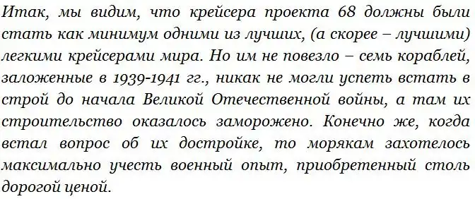 В целом же о модернизированном проекте 68К можно сказать следующее. Довоенный проект 68 оказался весьма хорош и имел неплохие запасы для модернизации, но необходимость установки развитого радиолокационного и зенитного вооружения по результатам военного опыта привела к полному исчерпанию модернизационного потенциала крейсеров типа «Чапаев». Безусловно, возможности ПВО крейсеров выросли едва ли не на порядок в сравнении с первоначальным проектом, но все же не дотягивали до пожеланий моряков (12*100-мм и 40*37-мм стволов). Крейсера проекта 68К оказались вполне современными кораблями на момент своего вступления в строй, но все же они обладали рядом недостатков, которые, увы, уже нельзя было устранить по причине ограниченных размеров кораблей этого проекта. Крейсера проекта 68К очень своевременно встали в строй – советский послевоенный флот отчаянно нуждался в кораблях, и на первых порах возможности «Чапаевых» отвечали задачам флота, но возобновлять дальнейшую закладку кораблей этого типа уже не было смысла – флоту требовался более современный крейсер.