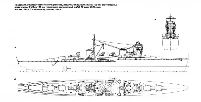 Так, из шести строящихся линкоров и тяжелых крейсеров следовало сосредоточиться на достройке всего лишь трех (линкор «Советская Россия», тяжелые крейсера «Кронштадт» и «Севастополь»), строительство двух линкоров следовало «ограничить» и еще один – «Советская Белоруссия» - разобрать на стапеле. А вот строительство легких крейсеров предполагалось продолжать – следовало до конца 1941 г заложить еще 6 легких крейсеров проекта 68. Что касается послевоенных программ, то они еще не были составлены, но ясно было, что измученная войной страна не сможет тут же приступить к созданию океанского флота. Таким образом, выходило, что основным кораблем ВМФ СССР на ближайшие годы станет легкий крейсер, при том что никаких «эскадр», в составе которых ему предназначалось служить, не будет. А это возвращало флот если и не к теории малой морской войны, то к действиям против превосходящих сил вражеского флота у наших берегов, для чего 180-мм калибр подходил лучше шестидюймовок. Ну а с учетом того, что требуемая противовоздушная оборона могла быть обеспечена только при размещении на корабле 180-мм пушек, вариант ЦКБ-17 действительно был оптимальным.
