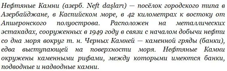 Нефтяные Камни — это уникальное морское месторождение, явившееся выдающимся событием в развитии нефтяного дела в СССР и Азербайджане в частности. Нефтяные Камни в тот период являлись крупнейшим в мире морским нефтяным месторождением, как по мощности залежи, так и по объему добываемой нефти. Нефтяные Камни по сей день являются уникальным городом на сваях. За короткий срок в открытом море, на расстоянии до 100 километров от берега были созданы крупные морские промыслы, оснащенные первоклассной по тем временам отечественной техникой. Нефтяные Камни считаются столицей Каспийского шельфа.