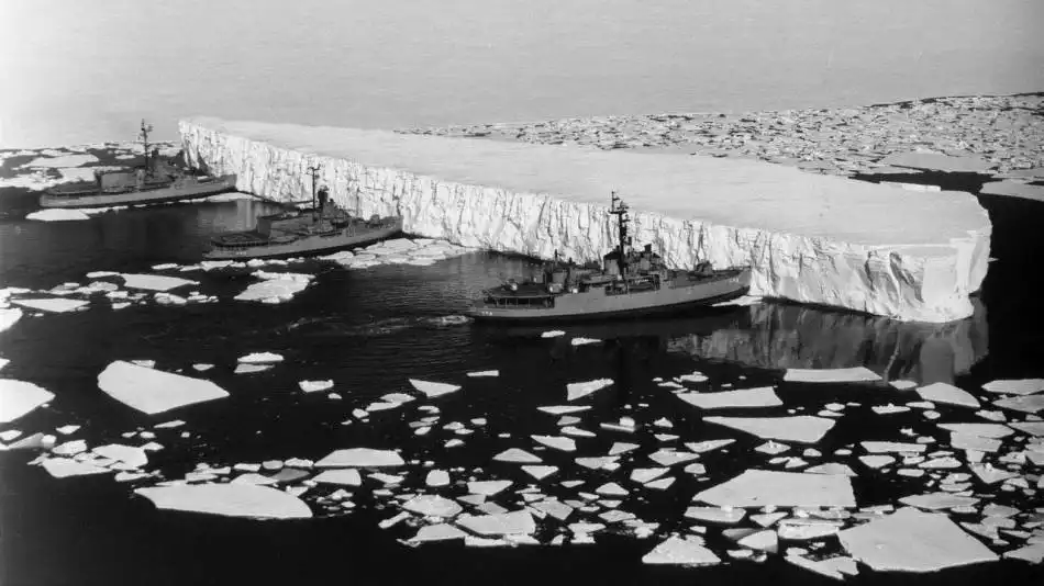 USS Atka (AGB-3) и USS Glacier (AGB-4) двигают айсберг заплывший в канал ведущий к