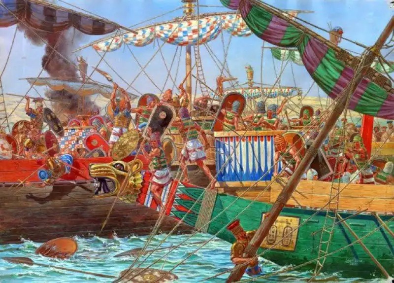 Разгромив хеттов, «народы моря» направились в Египет. Рамсес III встретил захватчиков в дельте реки Нил. Зная, что «народы моря» имели преимущество на открытой воде, Рамсес позволил им войти в дельту Нила. Там на них напал египетский военно-морской флот, который использовал шлюпочные якоря, чтобы заманить в ловушку вражеские суда. В это время лучники, находившиеся на берегу, обстреливали их градом стрел «А тех, которые вторглись с моря встретило в устьях Нила страшное пламя [царского гнева]: ограда из копий окружила их на побережье, их вытащили из воды, окружили и распростерли на берегу, убили и превратили в груду трупов».