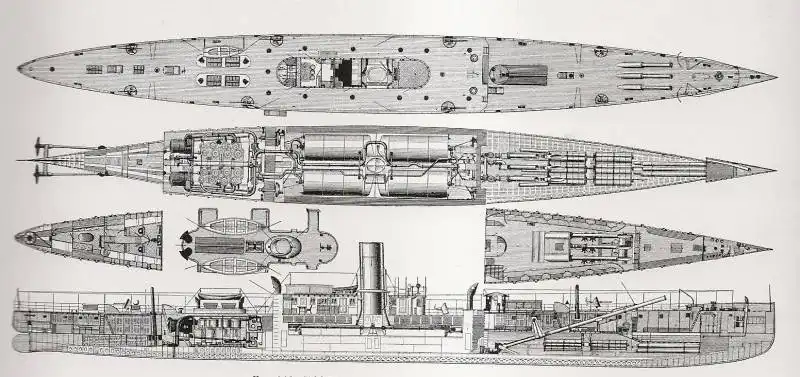 Носовая часть корпуса корабля, примерно треть от общей длины, отдавалась под размещение основного вооружения. Кроме того, в носу помещались некоторые дополнительные отсеки и помещения вспомогательного назначения, а также кубрики для экипажа. Центральный отсек, расположенный непосредственно под надстройкой, вмещал котлы и угольные ямы. В корме имелись главная паровая машина, а также жилые и вспомогательные помещения. Рубка вмещала центральный пост, кают-компанию и т.д. Кроме того, сквозь нее проходила единственная дымовая труба.