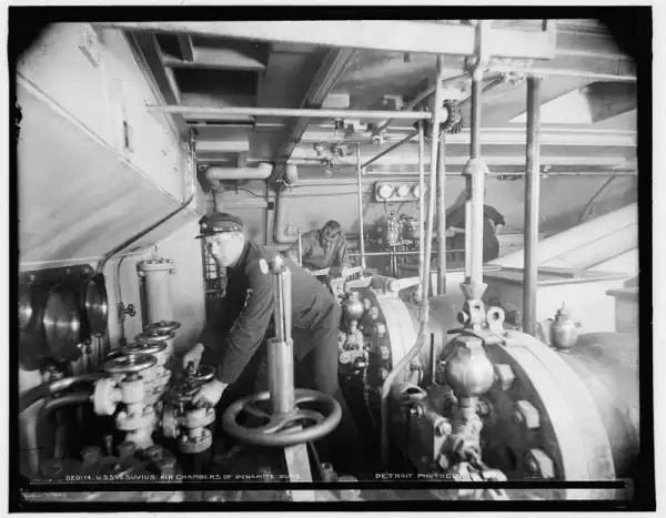 Внутри орудийного отсека также предусматривались места для размещения баллона сжатого воздуха. Баллон и два компрессора с паровым приводом, соединенным с главными котлами, могли обеспечивать давление до 1000 футов на кв.дюйм (70 атмосфер). Емкость баллона и производительность компрессоров позволяла производить подготовку к новому выстрелу за несколько минут. При помощи трубопроводов, манометров и клапанов артиллеристы должны были управлять работой пневматической части и ее взаимодействием с орудиями.