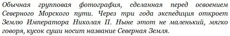 В центре, заложив руку за борт кителя, сидит командир "Вайгача", один из инициаторов ГЭСЛО (Гидрографической экспедиции Северного Ледовитого океана) капитан 2-го ранга Александр Колчак. Сбылась его заветная мечта - выйти на штурм Арктики на специально построенных судах с новейшим гидрографическим оборудованием...