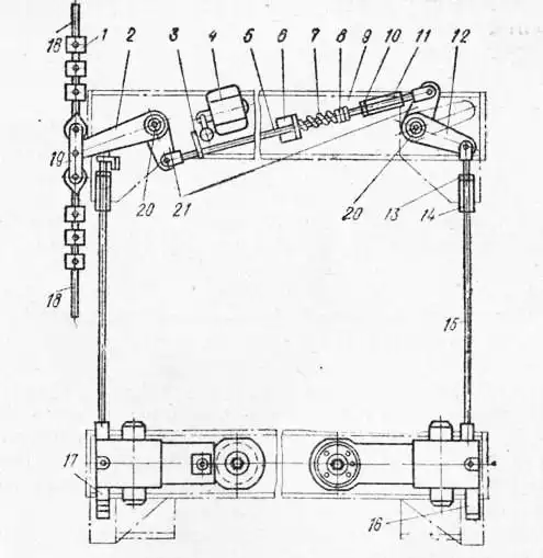 1 — зажим; 2 — приводиой рычаг; 3 — нажимная планка; 4 — блок—контакт ловителей; 5 —большая тяга; 5 — упор пружины; 7 — пружина; 8 —гайка; 9, 10, 13 — контргайки; 11, 14 — регулировочная муфта; 12 — рычаг15 — тяга; 16 — башмак; 17 —клин; 18 — канат ограничителя скорости; 19 — планка;) 20 — горизонтальные валы; 21 — рычаги