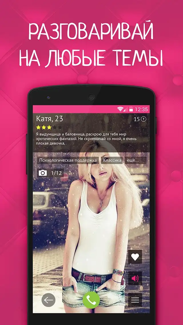 И так давайте поговорим про приложение MurMurPhone - это самый приятный на мой взгляд во всех отношениях чат для взрослых. Во-первых здесь очень много моделей, которые всегда готовы пообщаться. Во-вторых, есть возможность предварительно прослушать демо запись модели прежде чем звонить ей. В-третьих, полная анонимность, а это означает что только вы можете инициировать звонок, соответственно девушка не может вам перезвонить. В-четвертых, приложение имеет простой в управление интерфейс и у вас не возникнет проблем в общение с моделями. Ну и в-пятых, полная прозрачность тарификации общения, полный контроль баланса!