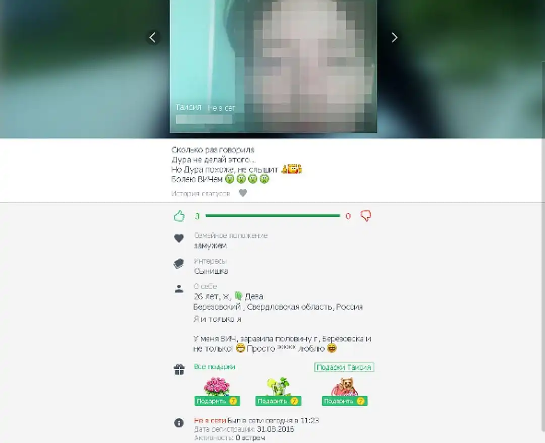 Эта история набирает популярность в интернете. Ее источник – страничка некой Таисии Шалуновой в социальных сетях, где она прямо пишет: «У меня ВИЧ, заразила половину г. Березовского и не только! Просто [заниматься сексом] люблю!»