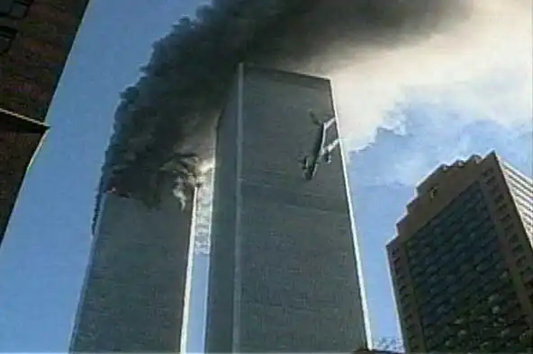 На этой фотографии запечатлен момент, когда самолет 175 UA врезался в южную башню в ходе террористической атаки 9 сентября 2011 года.
