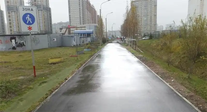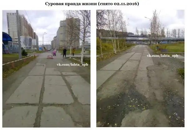 Спустя полтора года чиновники сообщили о выполнении работ и приложили к жалобе на портале фотографии дорожки с новым блестящим асфальтом. Однако, по данным «Лахта Онлайн», её отремонтировали только на картинках. Вот снимки с портала «Наш Санкт-Петербург», на которых изображён новый асфальт.