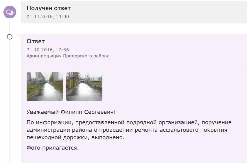 По данным паблика, в марте 2015 года на портале «Наш Санкт-Петербург» была оставлена жалоба о ненадлежащем состоянии пешеходной дорожки. Автор жалобы попросил положить на неё асфальт. В мае того же года администрация района пообещала выполнить ремонт дороги до 15 октября 2016 года.
