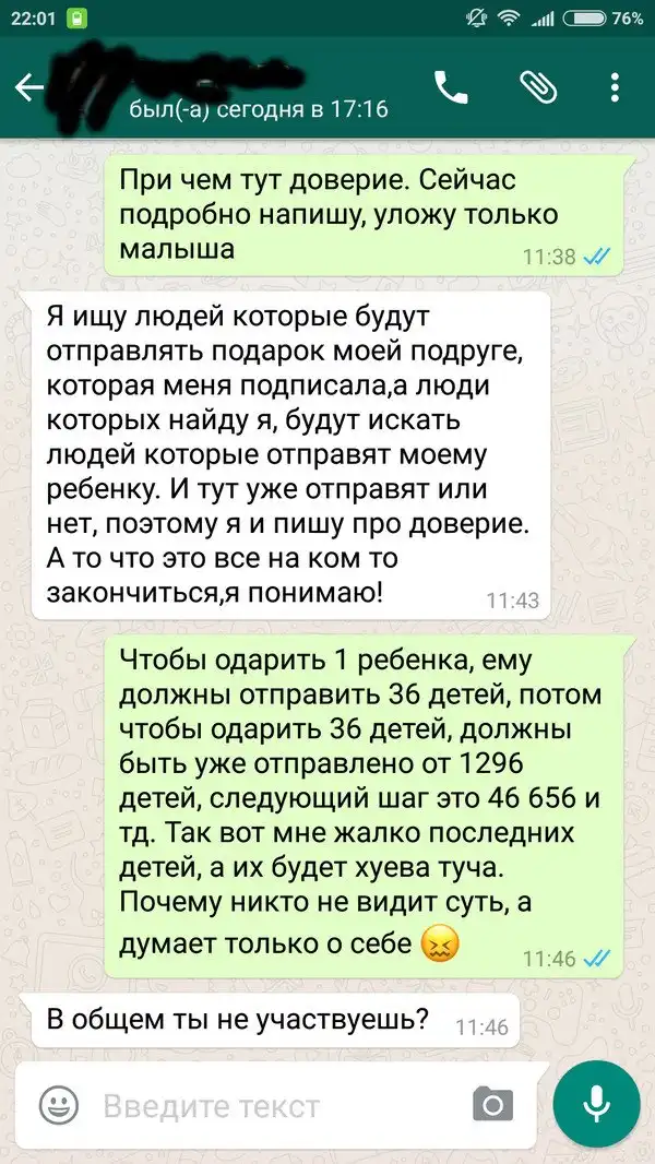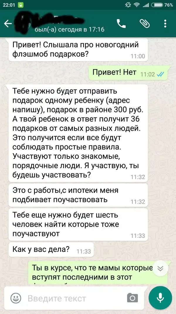 Дело в том, что во всех соц сетях сейчас идём массовые зазывания участия в новогоднем флешмобе. Который по факту является обычной финансовой пирамидой. Далее в фото пример попытки достучаться до человека, затянутого в эту пирамиду.