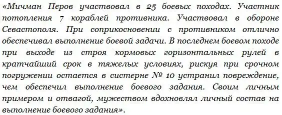Из представления на звание Героя Советского Союза боцмана Краснознамённой подводной лодки Л-4 Черноморского флота мичмана Ивана Степановича Перова: