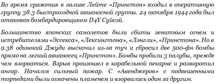По словам одного из спасшихся моряков, «взрыв был настолько же неожиданным, насколько ужасным. Я думаю, его можно было сравнить с извержением небольшого вулкана. Вся задняя часть «Принстона» взлетела в воздух и рухнула за кормой. Обломки, большие и маленькие, полетели вверх и в стороны, засыпав полетную палубу «Принстона».