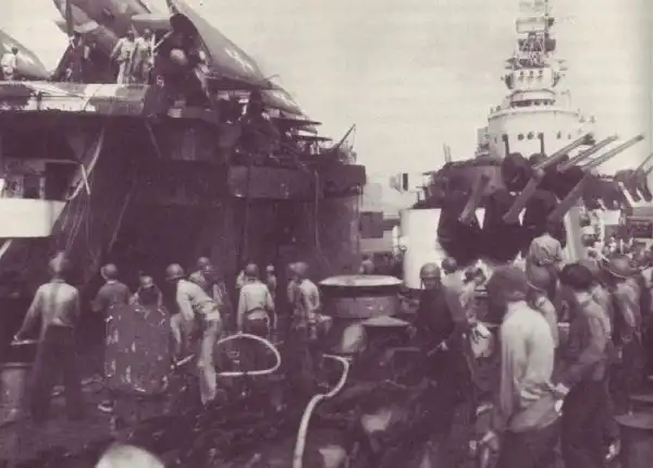 Крейсер «Бирмингем» пытается потушить пожар на «Принстоне»