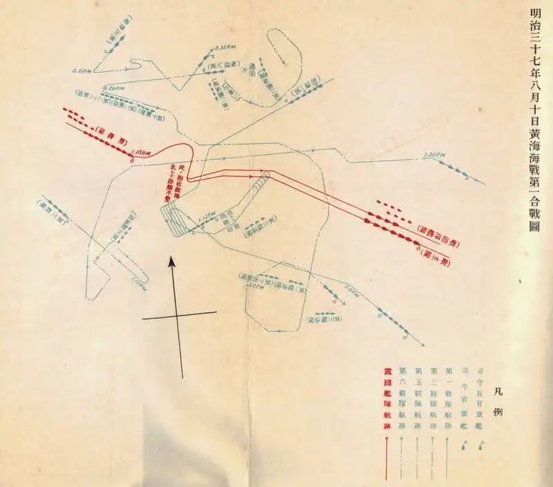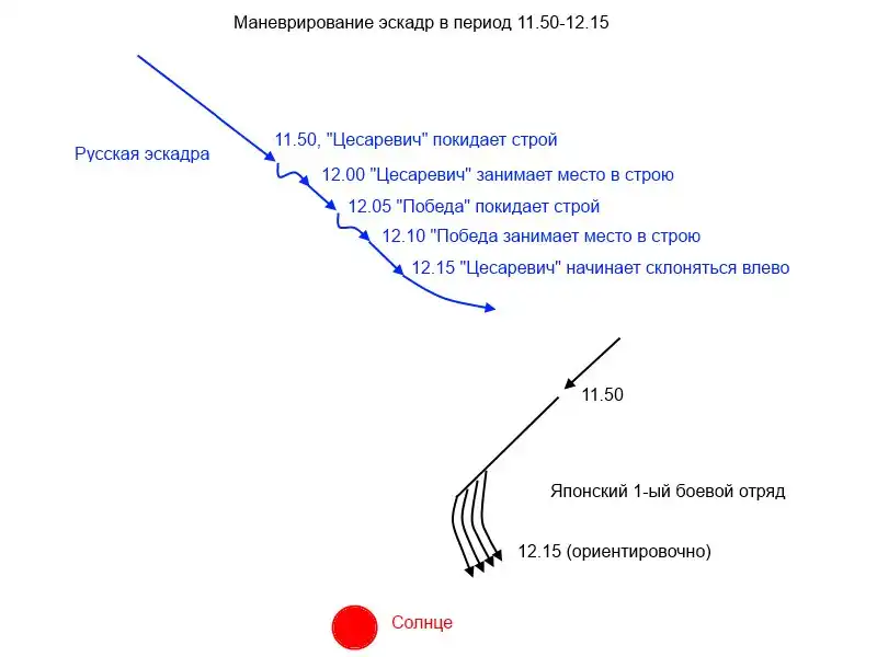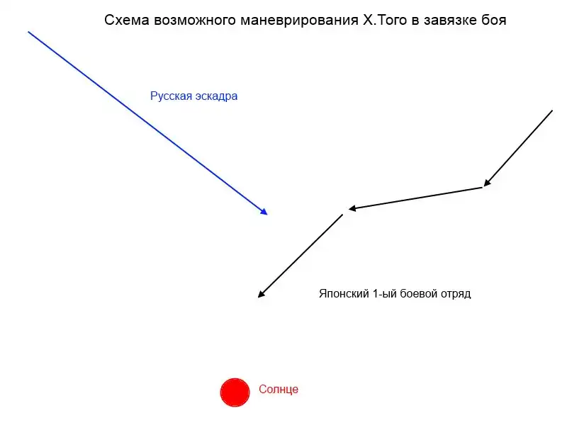 Вместо этого, в 1-ой фазе сражения Хэйхатиро Того предпринял ряд странных и непонятных маневров. Увидев русскую эскадру, Х. Того какое-то время вел свои корабли тем же курсом, но где-то в районе 11.40 отвернул влево, т.е. в сторону, противоположную той, где находились русские корабли.