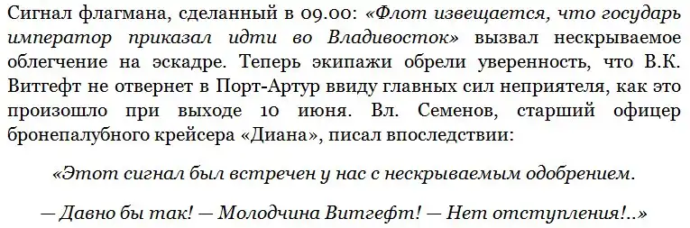 В 12.22 Хэйхатиро Того выставил «кроссинг Т» В.К. Витгефту… Примерно с тем же успехом Х. Того мог «пересечь курс русской эскадры», находясь где-нибудь у островов Эллиот, когда В.К. Витгефт еще не вывел свои корабли их Порт-Артура.