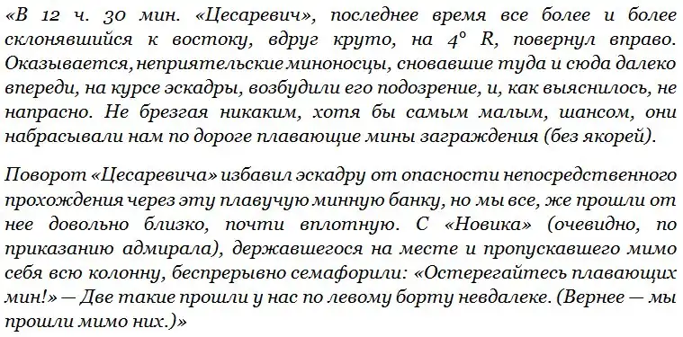 Разумеется, по прошествии стольких лет ничего невозможно утверждать наверняка, но рискнем все же выдвинуть версию, объясняющую все вышеперечисленные несообразности в действиях Х.Того. Забежим немного вперед: некоторые (но не все) источники отмечают, что в 12.30 «Цесаревич» сделал еще один, уже не плавный, а резкий поворот влево. С одной стороны, поворот этот легко обосновать хотя бы желанием выйти из-под «палочки над Т», но некоторые источники утверждают, что таким маневром флагман В.К. Витгефта обошел минную банку японцев. Так, Вл. Семенов пишет: