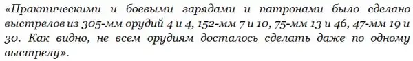Строго говоря, С.И. Лутонин не совсем прав. Эскадренный броненосец «Цесаревич» ушел на Дальний Восток прямо с французской верфи, и прибыл в Порт-Артур 19 ноября 1903 г, когда прочие корабли эскадры уже встали в вооруженный резерв: тем не менее, еще по дороге броненосец успел немного пострелять. Интересна была организация этих стрельб – идя в паре с броненосным крейсером «Баян», корабли попеременно буксировали щит, в то время как «попутчик» обстреливал его малокалиберными снарядами либо патронами. Однако это были только стволиковые, а не калиберные стрельбы, польза от них была несомненна, но для подготовки артиллеристов этого было совсем недостаточно. После прибытия «Цесаревич» в резерв не вводили, но и особой тренировки корабль не получил – в ноябре-декабре он стоял на внутреннем рейде, проводя лишь те учения, которые можно было вести стоя на якоре. Лишь 29 декабря корабль единственный раз вышел на стрельбы. По данным Р.М. Мельникова: