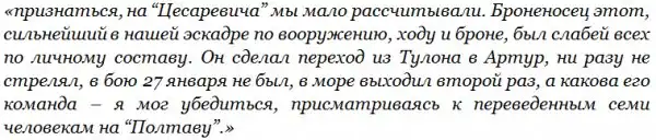 С точки зрения морской тактики тех лет, положение русской эскадры было заведомо проигрышным - отягощенная тихоходными броненосцами «Полтава» и «Севастополь», а теперь еще и «Ретвизаном», чьи переборки могли сдать в любой момент, она проигрывала в скорости главным силам японцев. В теории, конечно, можно было выделить «быстроходное крыло» в составе эскадренных броненосцев «Цесаревич», «Победа» и «Пересвет», которые, быть может, могли бы двигаться даже чуть быстрее японской линии (ее скорость была ограничена достаточно тихоходным «Фудзи»). Но перечисленные корабли были слабейшими броненосцами русской эскадры и потому не имели шансов разбить 1-ый боевой отряд Х. Того. «Броненосцы-крейсеры» «Пересвет» и «Победа» по своим техническим характеристикам занимали промежуточное положение между броненосцами и броненосными крейсерами, а кроме того, плохо стреляли: на маневрах в июле 1903 года хуже этих броненосцев-крейсеров отстрелялся только «Петропавловск». Что касается «Цесаревича»… Безусловно, по своим паспортным данным это был мощный корабль, способный драться один на один с любым японским броненосцем. Однако же, как писал старший офицер «Полтавы» С.И. Лутонин: