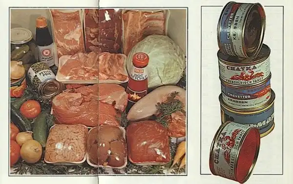 Красочные иллюстрации с изображением продуктов из прейскуранта магазина «Березка»