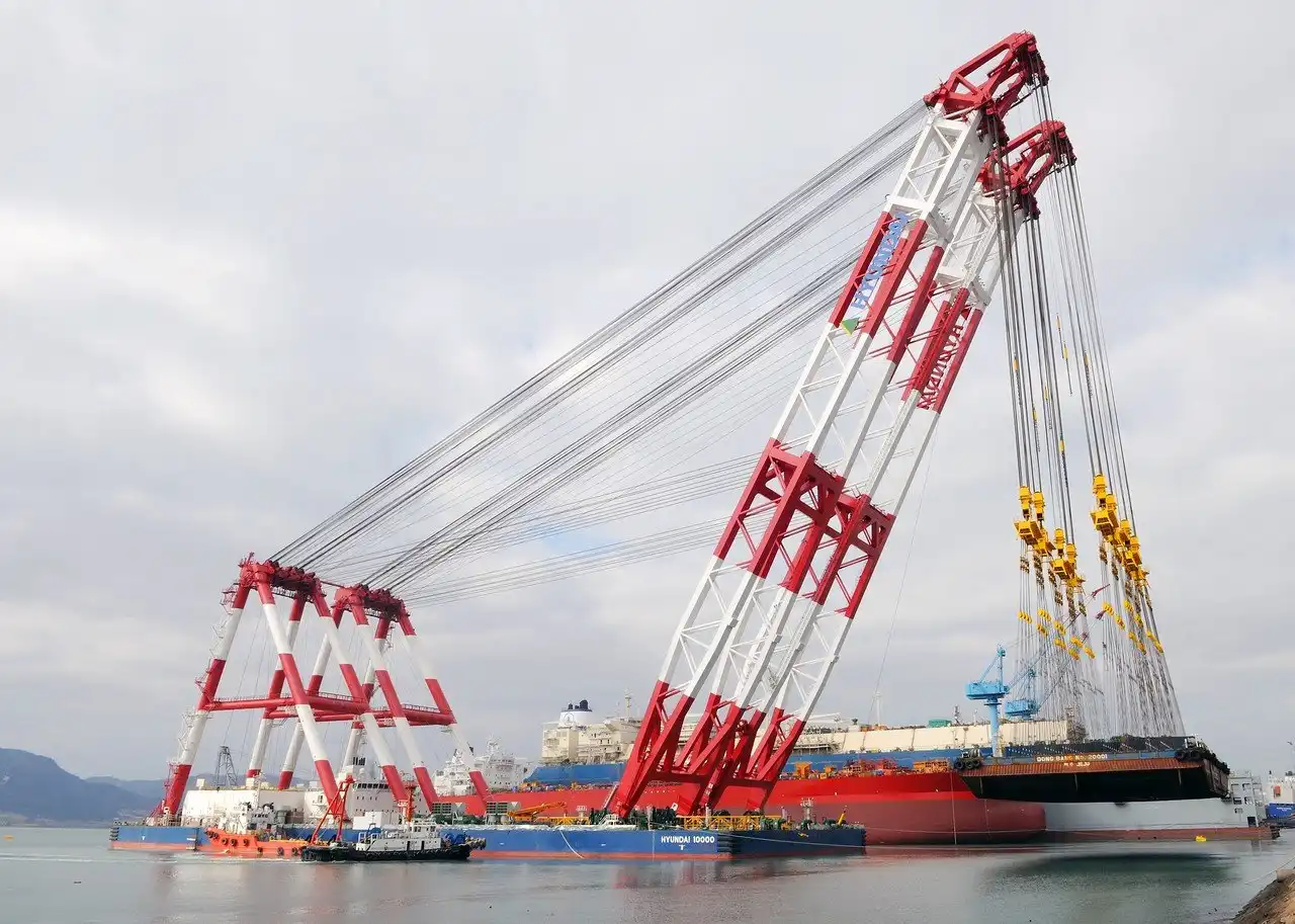 Конструкция подъемного механизма крана Hyundai-10000 рассчитана таким образом, что он сможет удержать свой груз даже в самой чрезвычайной ситуации. В случае подъема и транспортировки особо тяжелого и габаритного груза специальные цистерны заполняются забортной водой для придания крану дополнительной массы и устойчивости. За счет этого кран способен поддерживать угол крюка, равный 15 градусам, со стороны любого из бортов, и 20 градусов - со стороны кормы.