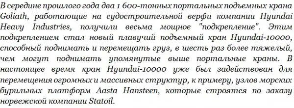 "Раньше, имея в своем распоряжении 1 600-тонные Goliath-ы, мы могли строить и перемещать только относительно небольшие модули. Это означает, что наши рабочие должны были выполнять в пять раз больше операций по перемещению, монтажу и установке этих модулей" - рассказывает Пак Джонг-бонг (Park Jong-bong), руководитель одного из отделов компании Hyundai Heavy Industries, - "Теперь же мы можем собрать один 8 000-тонный модуль, переместить его туда, куда надо, и сразу установить его на место с высокой точностью".