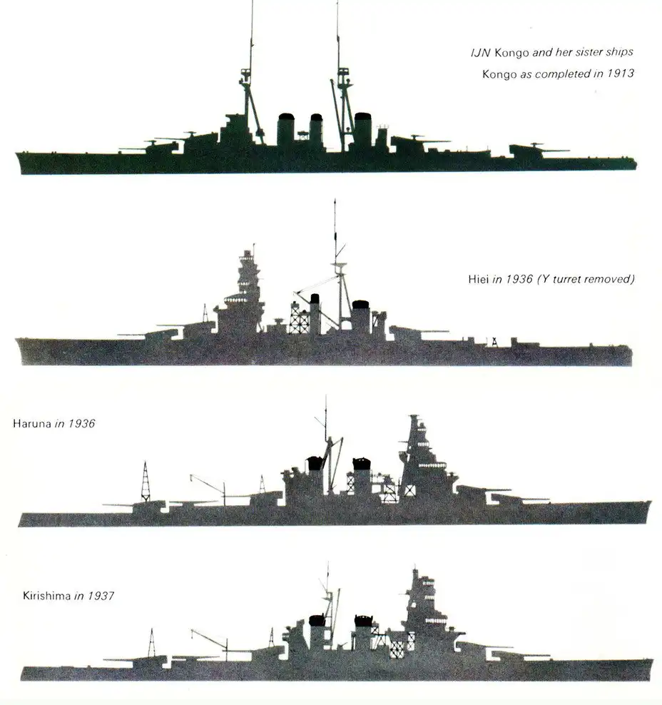 Силуэты кораблей: «Конго» в 1913 году, «Хией» в 1936 году в