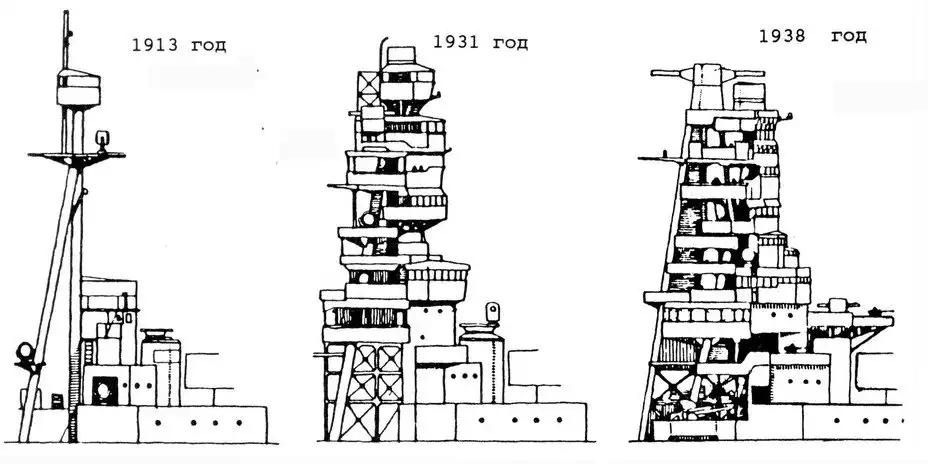 Изменения в системе управления огнем в этот период вызывают ряд вопросов. Согласно большинству источников, в 1929-1931 годах на пагодообразной надстройке был установлен 10-метровый дальномер, а вторую и третью башни главного калибра оборудовали новыми 6-метровыми дальномерами – все так же в отдельных броневых башенках. А. Дашьян пишет о 8-метровых дальномерах в башнях главного калибра, однако на всех известных фотографиях «Конго» 1926–1929 годов надстройка дальномера на крыше второй башни заметно меньше ее диаметра, а на фото 30-х годов у всех кораблей этого класса концы дальномеров уже явно выступают за края башен. При этом известно, что ширина задней части крыши башни на линкорах этого типа составляла 6,2 м. Таким образом, можно констатировать, что не позднее начала 30-х годов 4,5-метровые дальномеры в башенках на внутренних башнях главного калибра были заменены дальномерами с большей базой (очевидно, 6-метровыми), размещенными в продолговатых надстройках поверх задней части башен.